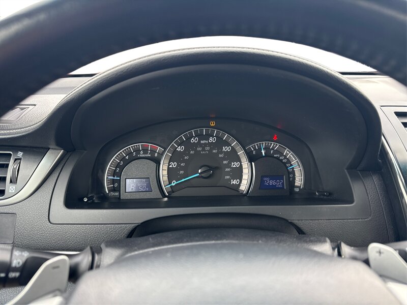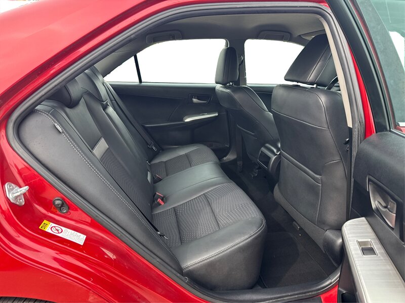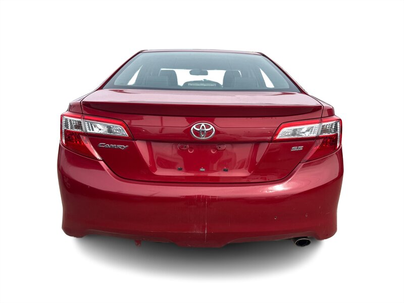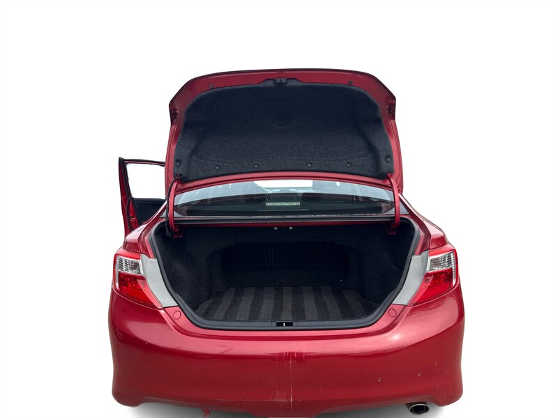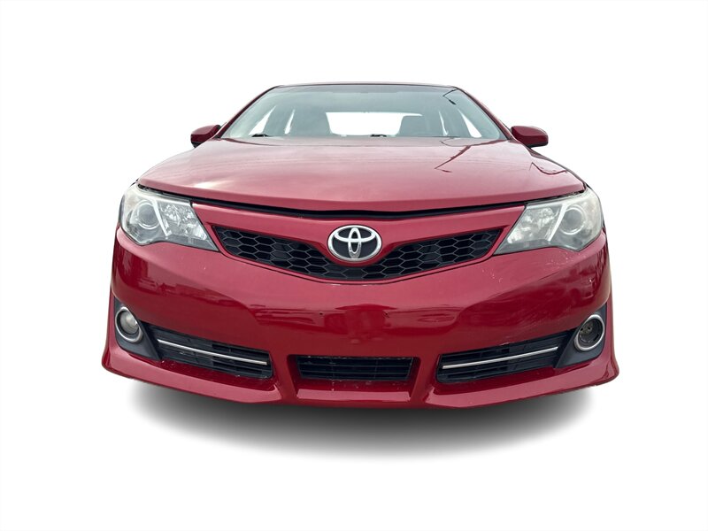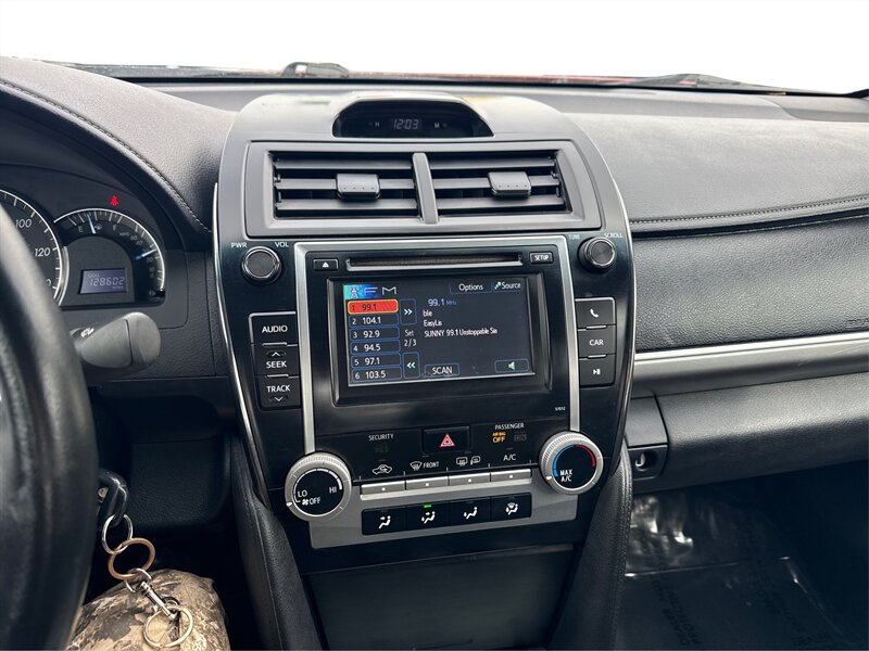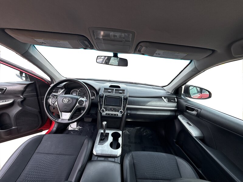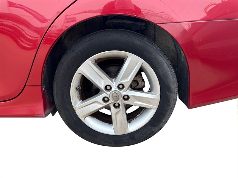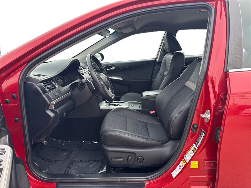2012 Toyota Camry L with the 2.5L I4 engine (178 hp, 170 lb-ft) in Red exterior and Black cloth interior; excellent overall condition with under 129,000 miles (averaging less than 9,000 miles per year). EPA-rated fuel economy is approximately 25 MPG city and 35 MPG highway, paired with the factory 6-speed automatic transmission. Factory-standard features include cloth seating with 60/40 split-folding rear seat, manual seat adjustments, air conditioning, power windows and door locks, remote keyless entry, cruise control, tilt steering, AM/FM/CD audio with auxiliary input, tire pressure monitoring, anti-lock brakes with electronic brake-force distribution, vehicle stability control and traction control, front and side-impact airbags with side curtain airbags, and LATCH child-seat anchors.
