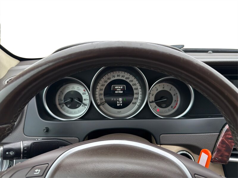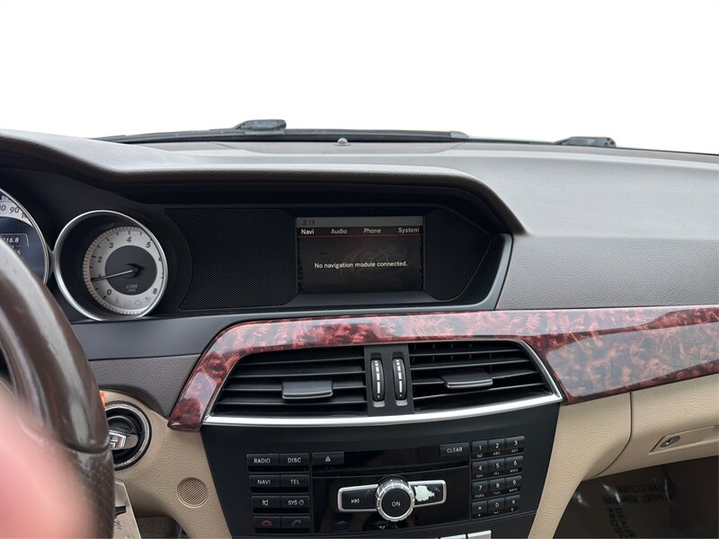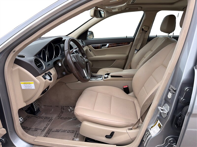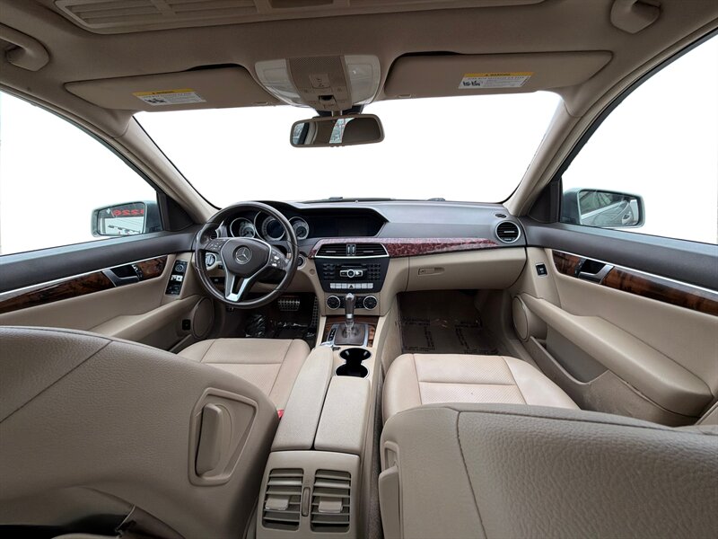 2014 Mercedes-Benz C 250 Sport in tan exterior with tan interior, powered by a 1.8L turbo I4 (201 hp, 229 lb-ft). Factory equipment includes a sport-tuned suspension, 7-speed automatic transmission, alloy wheels, automatic headlights and fog lamps, dual-zone automatic climate control, power-adjustable front seats, multifunction steering wheel with audio and Bluetooth controls, AM/FM/CD/aux/USB audio, remote keyless entry, ABS with traction and stability control, multiple airbags and tire-pressure monitoring. Below 102,000 miles (averaging under 8,000 miles/year), EPA-rated at 22 MPG city / 31 MPG highway, and in excellent overall condition.
