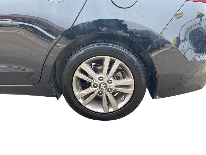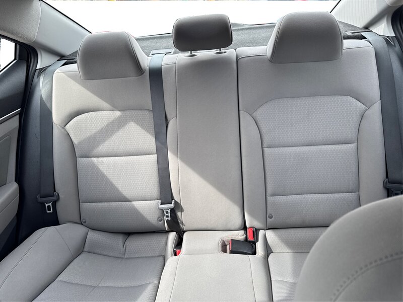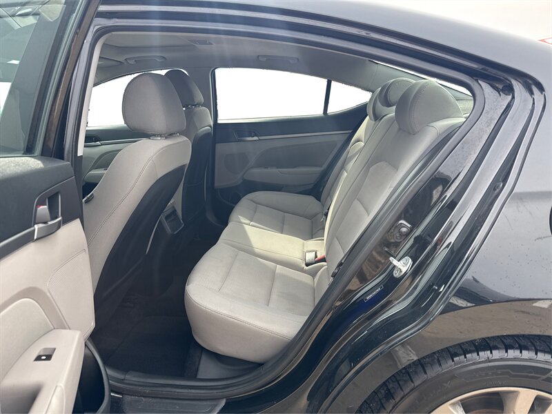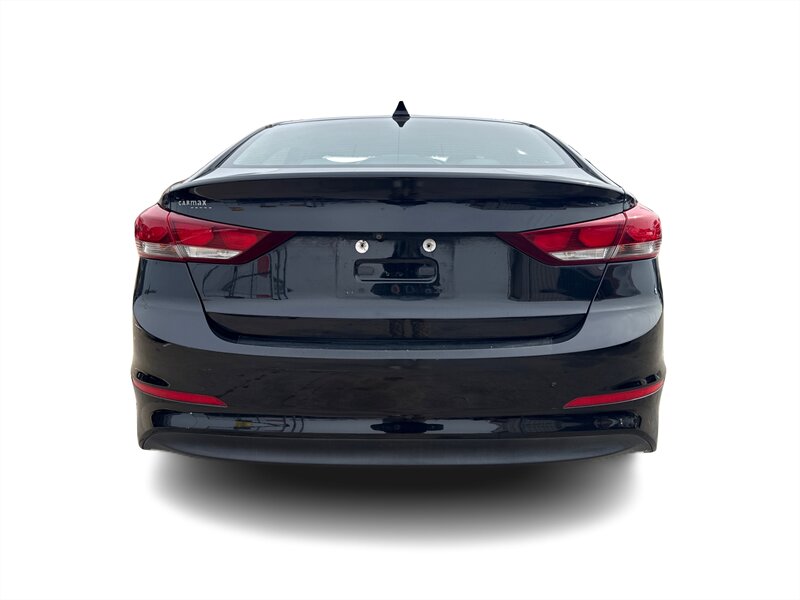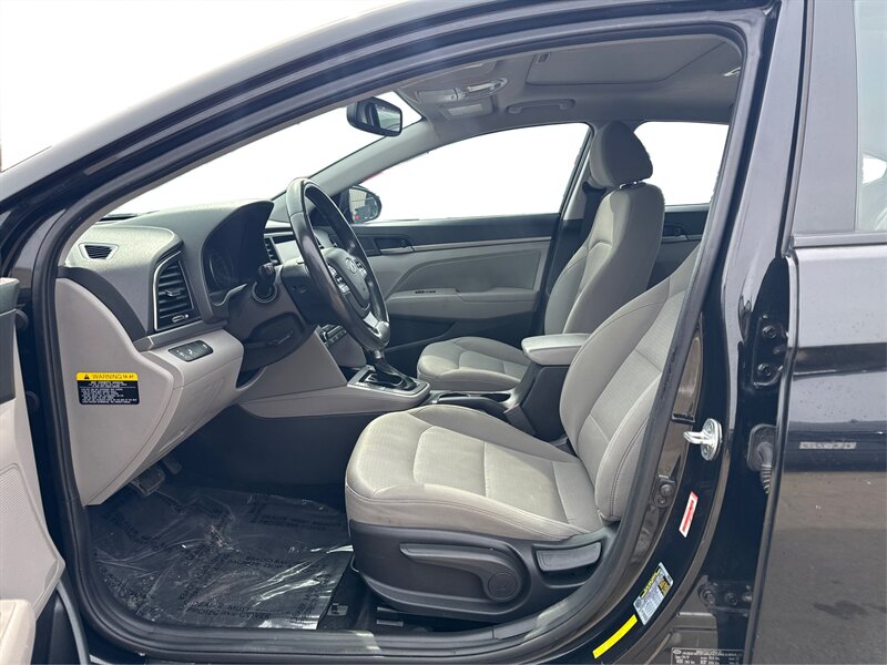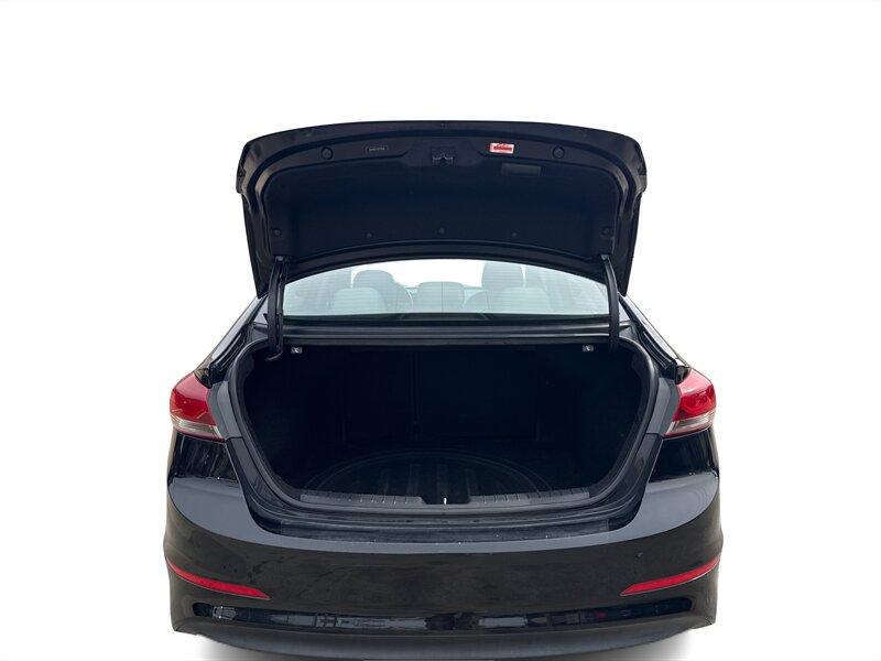 2018 Hyundai Elantra SEL in Black exterior with Black cloth interior, powered by the Nu 2.0L I4 (147 hp, 132 lb-ft), EPA-rated at 28 MPG city / 37 MPG highway; the vehicle is in excellent overall condition. Factory-equipped features include remote keyless entry, power windows and locks, tilt-and-telescoping steering column, cruise control, a center console with storage, 60/40 split-folding rear seats, a touchscreen infotainment system with Bluetooth hands-free calling and audio streaming plus USB/AUX inputs, steering-wheel audio and phone controls, and 16-inch alloy wheels with projector-style halogen headlights and daytime running lights. Standard safety and convenience equipment from the factory include a backup camera, ABS with electronic stability and traction control, multiple airbags, and tire pressure monitoring.