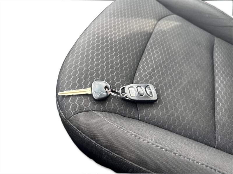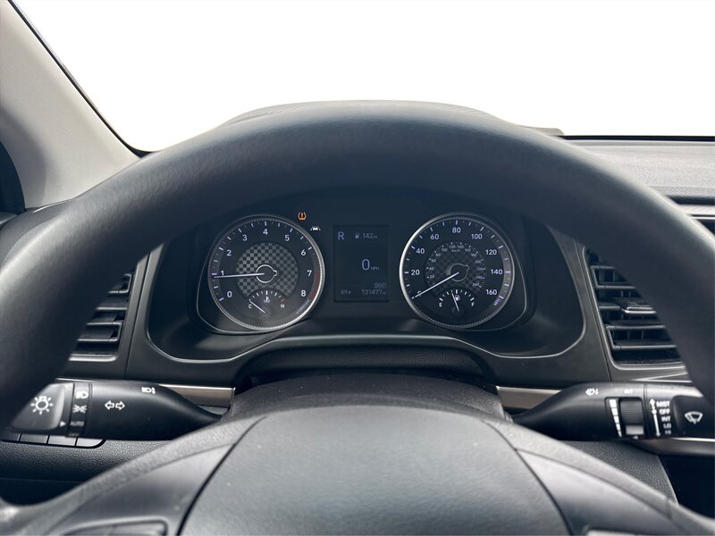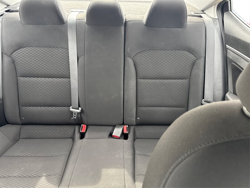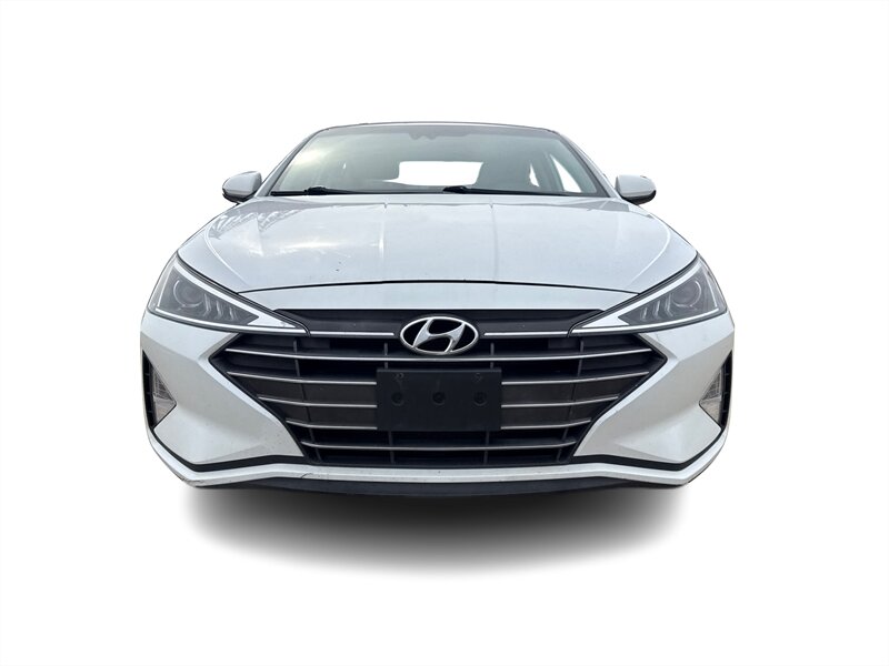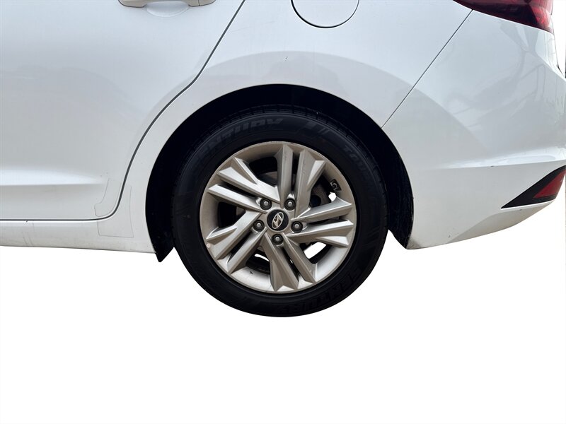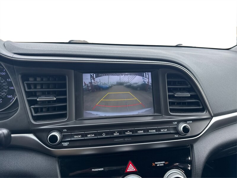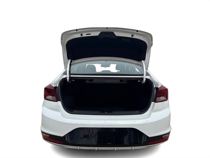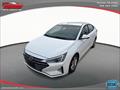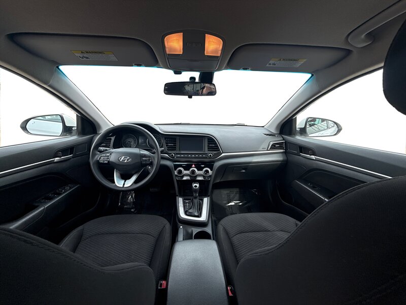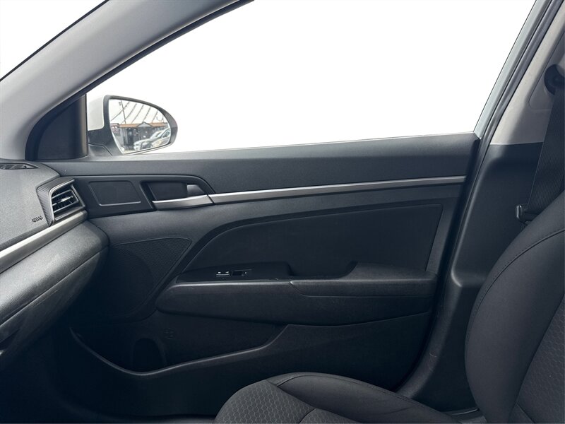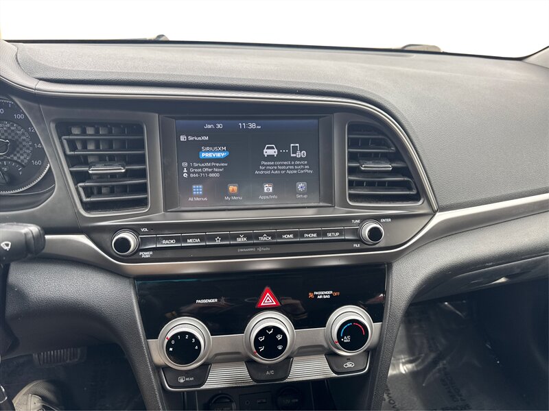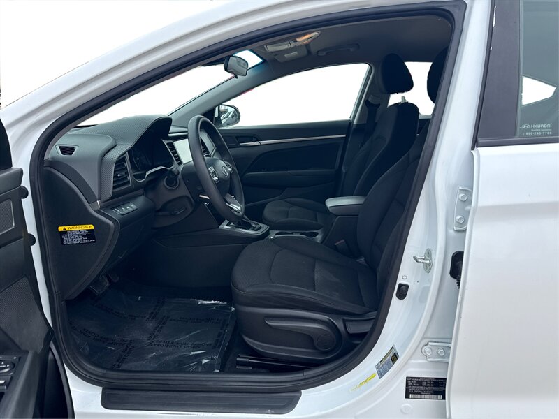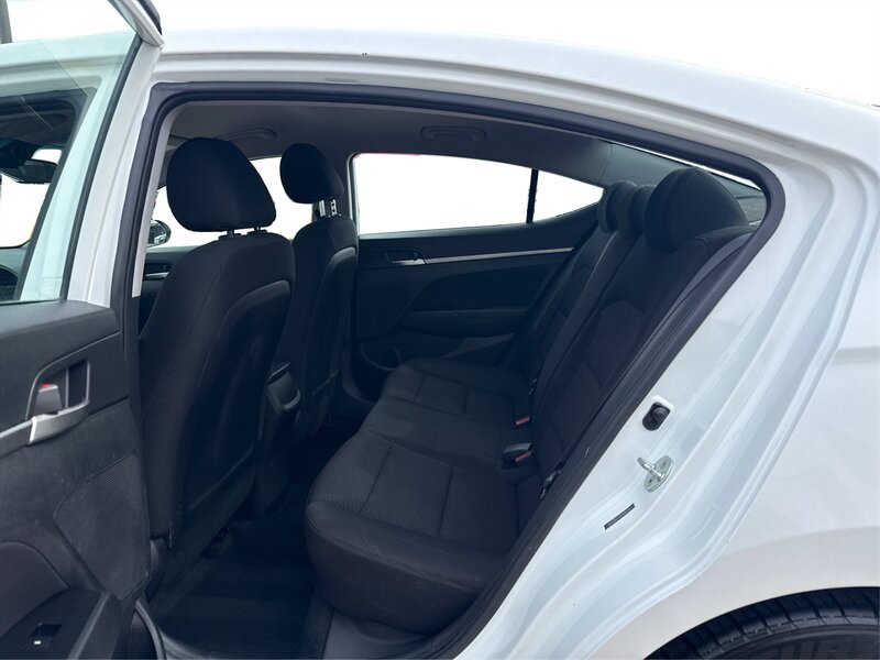 2019 Hyundai ELANTRA SE — White exterior with Black cloth interior. Powered by the Nu 2.0L I4 (147 hp, 132 lb-ft) and rated at 26 MPG city / 36 MPG highway. Factory-standard equipment includes a 7-inch touchscreen with Apple CarPlay/Android Auto and Bluetooth, AM/FM audio with USB and auxiliary inputs, rearview camera, full power accessories and remote keyless entry, cruise control, tilt-and-telescoping steering wheel, manual air conditioning, cloth seating with 60/40 split-folding rear seat, projector halogen headlights and daytime running lights. Standard safety features include ABS, electronic stability and traction control, hill-start assist and a comprehensive airbag system. Vehicle is in excellent overall condition.